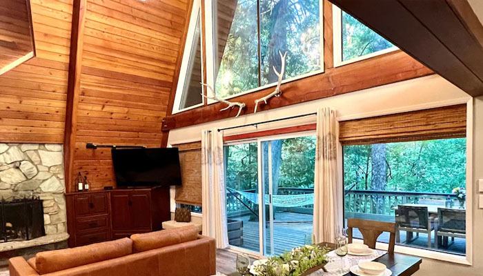 The tall triangular roof draws your eyes upward — it makes even a 600-square-foot cabin feel expansive. The wood beams, slanted walls, and simple finishes invite you to slow down. Everything is intentional, from the view framed by that giant window to the warm glow of light that spills onto the floor at dusk.